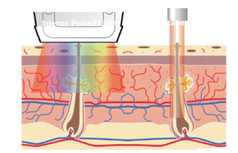 IPL (or Intense Pulsed Light) and Laser (or Light Amplification by Stimulated Emission of Radiation) are two forms of light therapy commonly used in the aesthetic industry for purposes of permanent hair reduction, vascular treatments, skin resurfacing and rejuvenation depending on the type of light used (IPL/Laser) for the appropriate skin color. IPL is not only used for hair removal but a wide variety of skin pigmentation, vascular reductions and skin rejuvenation treatments due to its broad wavelength that can target several pigments in the skin. Both treatment principles involve targeting chromophores (color bearing light absorbing particles) like melanin in the skin or hair follicle and haemoglobin in blood vessels.